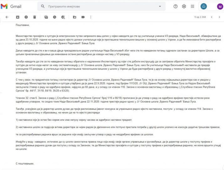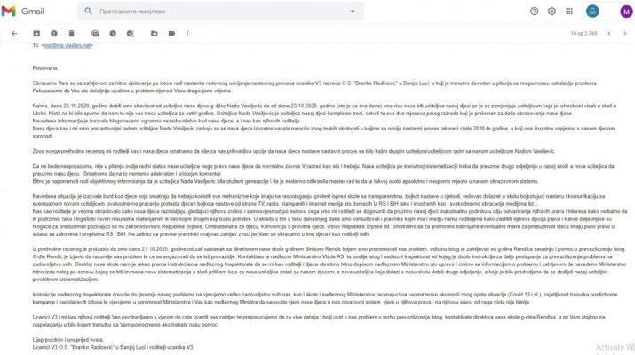 Najavljujući ovaj bojkot, roditelji su priložili i dva dokumenta – dopis roditelja nadležnom Ministarstvu prosvjete i kulture RS, upućen u oktobru ove godine, kao i odgovor te institucije.