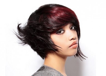 Maestralan pristup kratkoj kosi, ova asimetrična frizura reljefnih slojeva dodatno naglašava crne nijanse kose koje su “prelivene” trenutno veoma popularnim pramenovima boje crvenog vina.