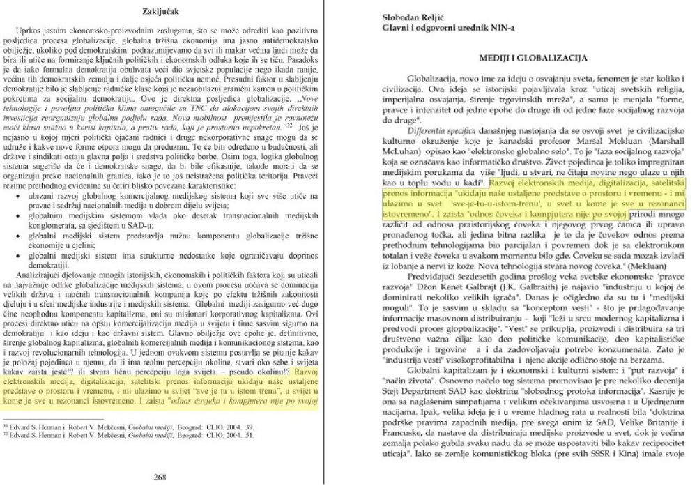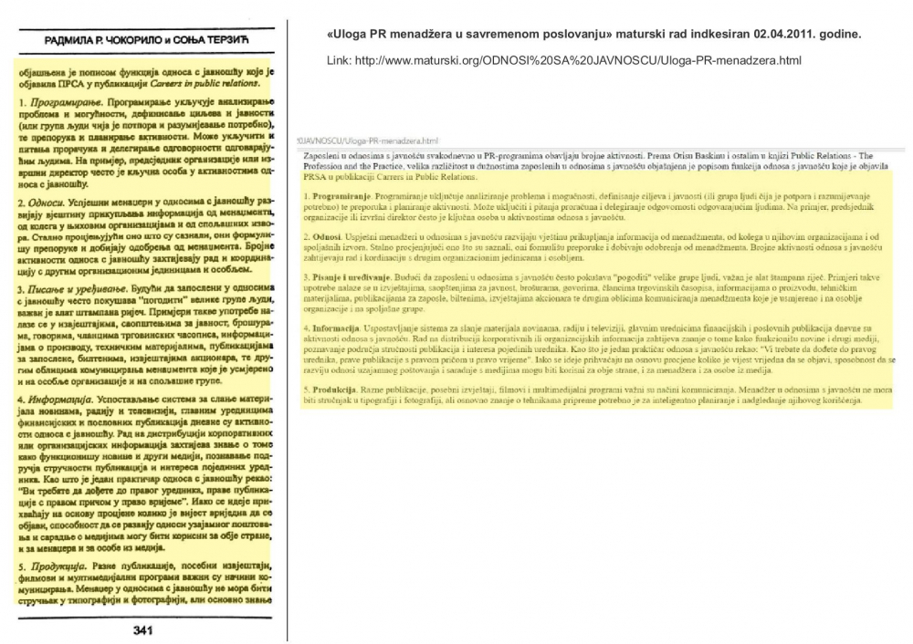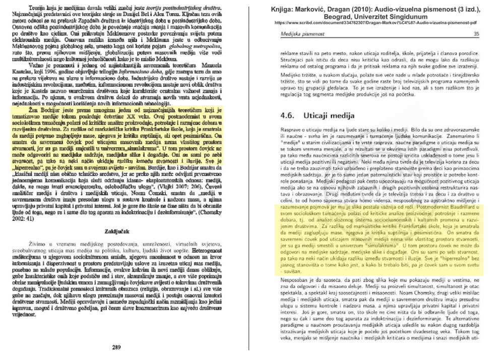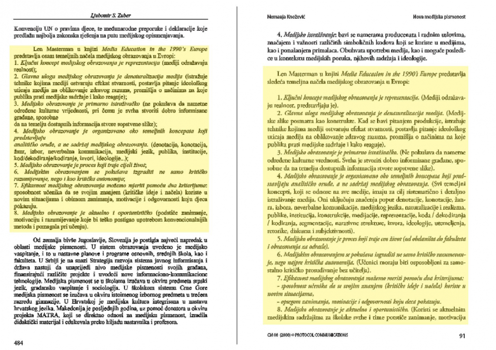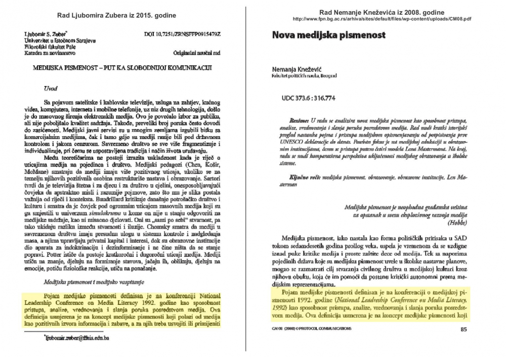 Velike dijelove svog “originalnog naučnog rada” Zuber je metodom copy-paste “pođonio” iz radova autora Nemanje Kneževića (“Nova medijska pismenost”, 2008.) i Dragana Markovića (“Audio-vizuelna pismenost”, treće izdanje, Beograd, Univerzitet Singidunum, 2010.), kao što se može vidjeti iz tekstova koje objavljujemo u prilogu. Pri tome, u popisu literature Zuber nigdje ne navodi da je citirao pomenute autore (iako ni to ne bi opravdalo obilato korištenje tuđih radova).