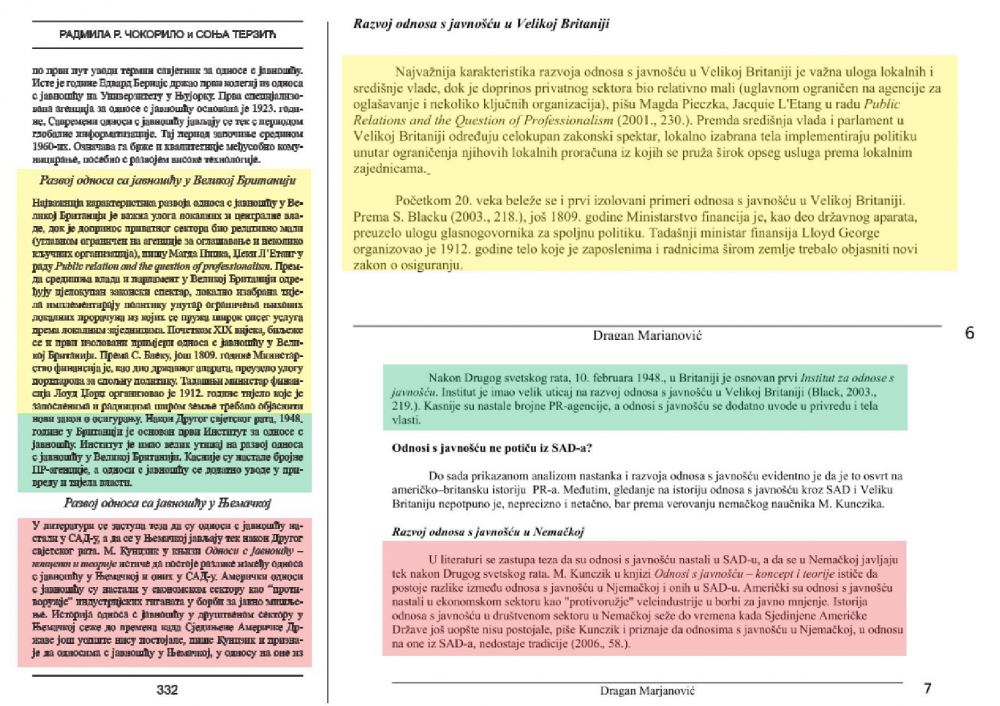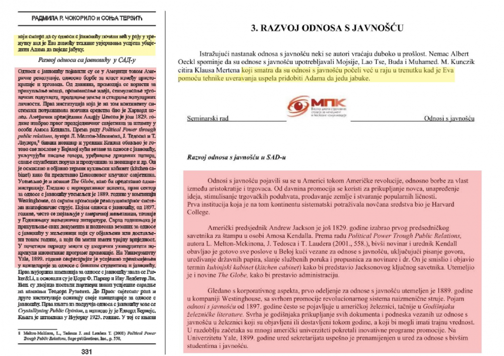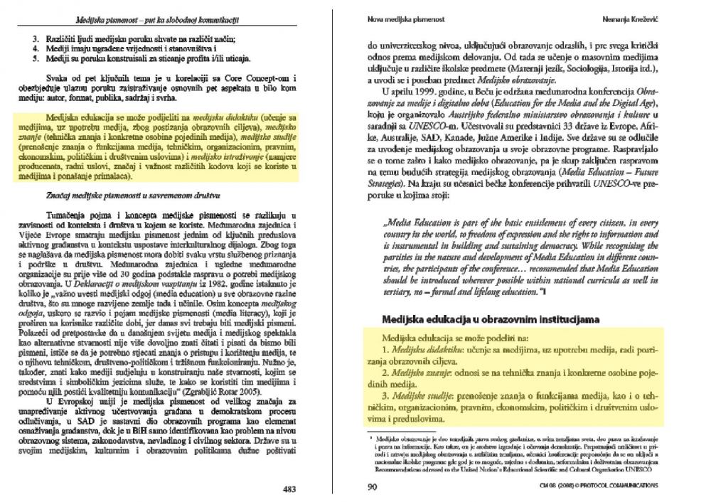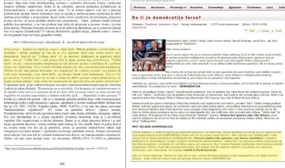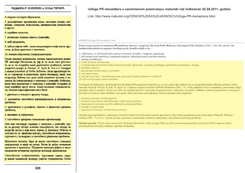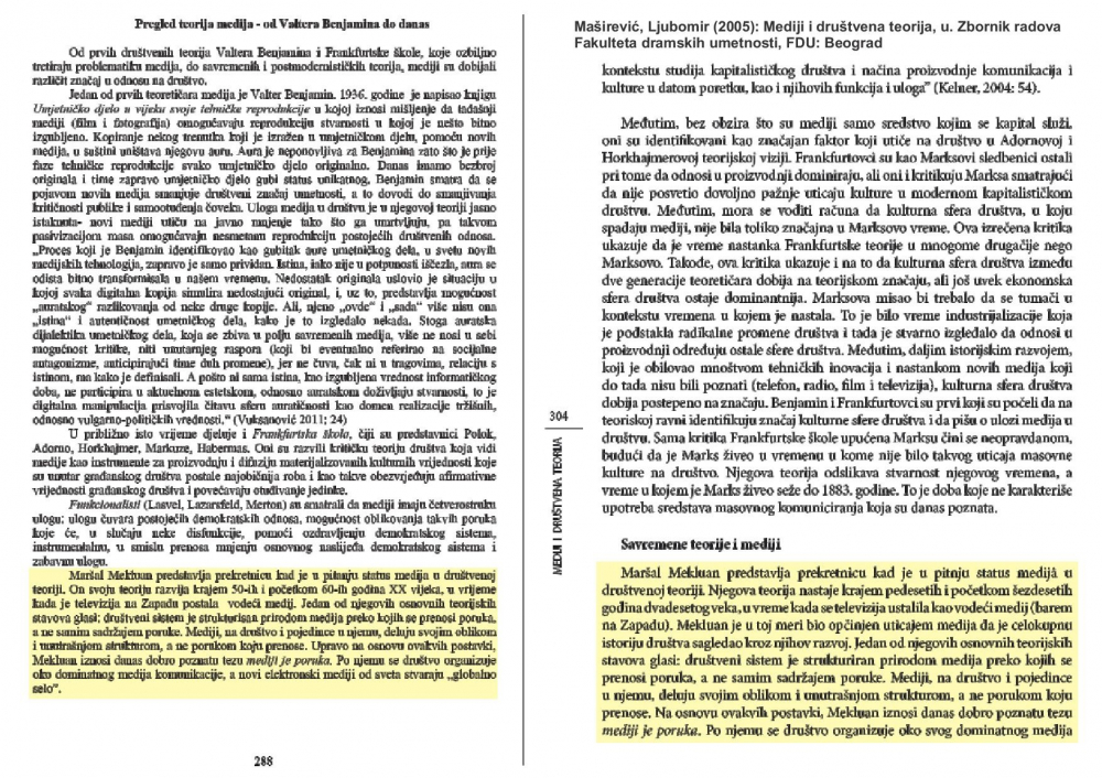 Velike dijelove svog “originalnog naučnog rada” Zuber je metodom copy-paste “pođonio” iz radova autora Nemanje Kneževića (“Nova medijska pismenost”, 2008.) i Dragana Markovića (“Audio-vizuelna pismenost”, treće izdanje, Beograd, Univerzitet Singidunum, 2010.), kao što se može vidjeti iz tekstova koje objavljujemo u prilogu. Pri tome, u popisu literature Zuber nigdje ne navodi da je citirao pomenute autore (iako ni to ne bi opravdalo obilato korištenje tuđih radova).