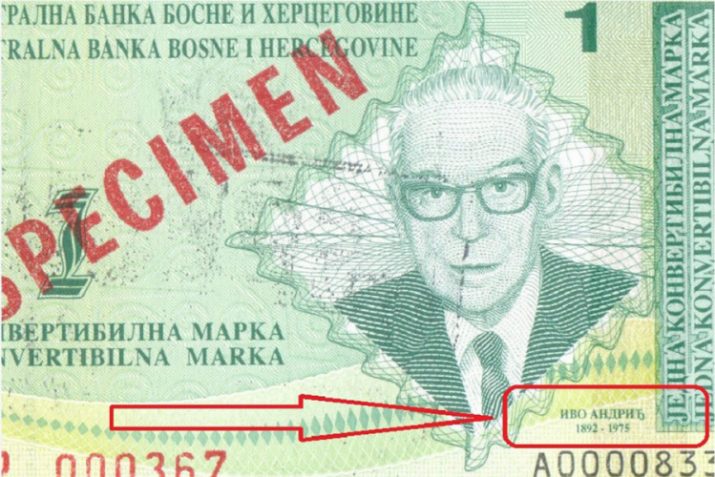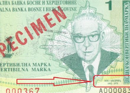 Novčanica potiče iz 1998. godine. Izdanje je predviđeno za Republiku Srpsku, a Ivo Andrić je napisano na ćiriličnom pismu. Ali, ako obratite pažnju, vidjećete da je napravljena slovna greška, te da umjesto Ivo Andrić na ćirilici piše Ivo Andriđ, dodaje “N1”.