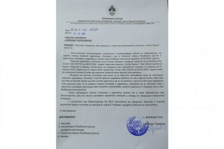 “Nakon rješavanja sporne situacije u Udruženju dužni ste o tome obavijestiti ovo ministarstvo kako biste mogli nastaviti koristiti lovište”, naveli su iz Ministarstva.