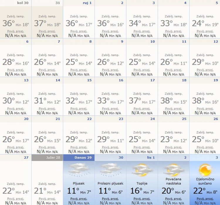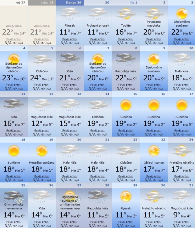 Posljednjih dana u našoj zemlji prilično je hladno vrijeme. Kiša je i temperature su pale ispod 15 stepeni, no, ako je vjerovati stranici Accuweather, razvedravanje stiže već krajem sedmice, i toplije vrijeme zadržat će se kroz oktobar, što znači bismo mogli imati dugo tzv. bablje ili miholjsko ljeto.