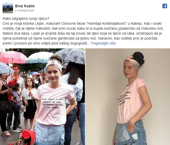 “Ona je imala najljepšu haljinu, haljinu humanost i čovječnosti i ona nije jedina koja je ovo uradila. Ona je obično dijete s pozitivnim i negativnim osobinama, ali poslala je finu poruku društvu, a to je da imamo ljude kojima smo potrebni i da im trebamo pomoći” – kazao je Eniz koji je inače profesor u jednoj srednjoj školi u Kaknju.