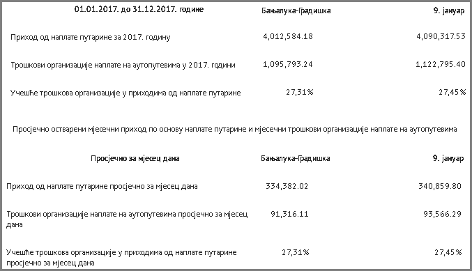 U istom periodu na autoputu „9. januar“, na dionici Doboj – Prnjavor, naplaćeno 4,09 miliona KM po osnovu putarine, dok je na organizaciju naplate potrošeno više od 1,1 miliona KM.