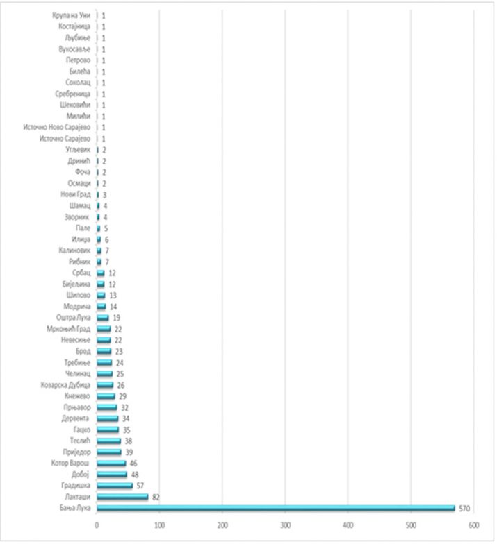 Potvrđeni slučajevi infekcije virusom SARS-CoV-2 do danas su registrovani u 45 opština u RS. Najveći broj oboljelih registrovan je u Banjaluci – 570, te u Laktašima, Gradiški, Doboju, Kotor Varošu, Tesliću, Prijedoru, Derventi .