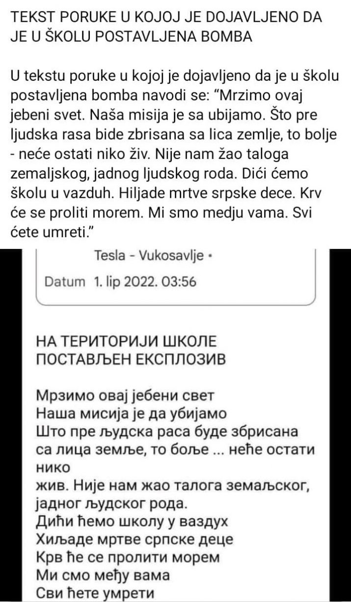 Na mejl adrese više škola širom Srpske stigle su dojave o postavljenim bombama, a ovo je sadržaj mejla koji su jutros zaprimile škole.