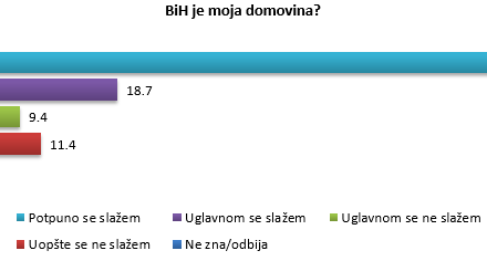 Više od polovine ispitanika se u potpunosti se složilo sa tvrdnjom „BiH je moja domovina“, njih 56,5%, a uglavnom se slaže njih 18,7%, što ukupno čini 75,2% ispitanika koji se potpuno ili uglavnom slažu sa konstatacijom da je Bosna i Hercegovina njihova domovina.