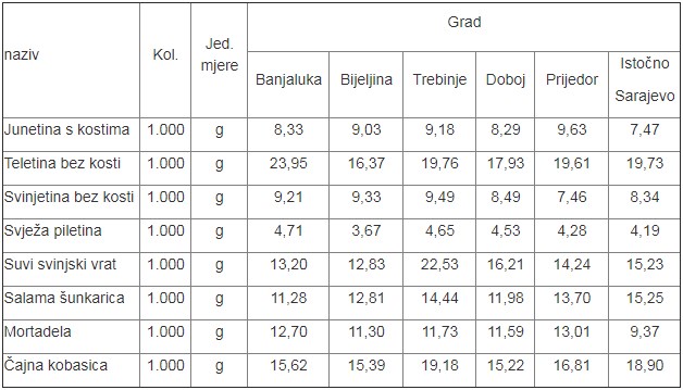 Cijene mesa u mesnicama znatno se razlikuju po gradovima u BiH pa ćete tako kilogram teletine bez kosti u Banjaluci platiti oko 24 KM za kilogram, dok u Bijeljini košta oko 16,5 KM, a u Tuzli oko 18 KM.
