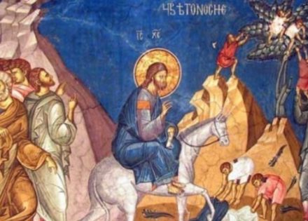Hristos je u grad ušao jašući na magarcu, a narod ga je dočekao kao cara, prostirući ispred njega svoje haljine i grančice drveća i noseći u rukama grančice palme.