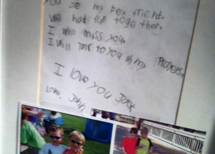 “Jack, ti si moj najbolji prijatelj. Zajedno smo se zabavljali. Nedostajat ćeš mi. Bit ćeš u mojim molitvama. Volim te Jack”, poruka je kojom se od jedne od najmlađih žrtava pokolja u osnovnoj školi Sandy Hook u Newtownu, šestogodišnjeg Jacka Pinte, oprostio njegov najbolji prijatelj John.