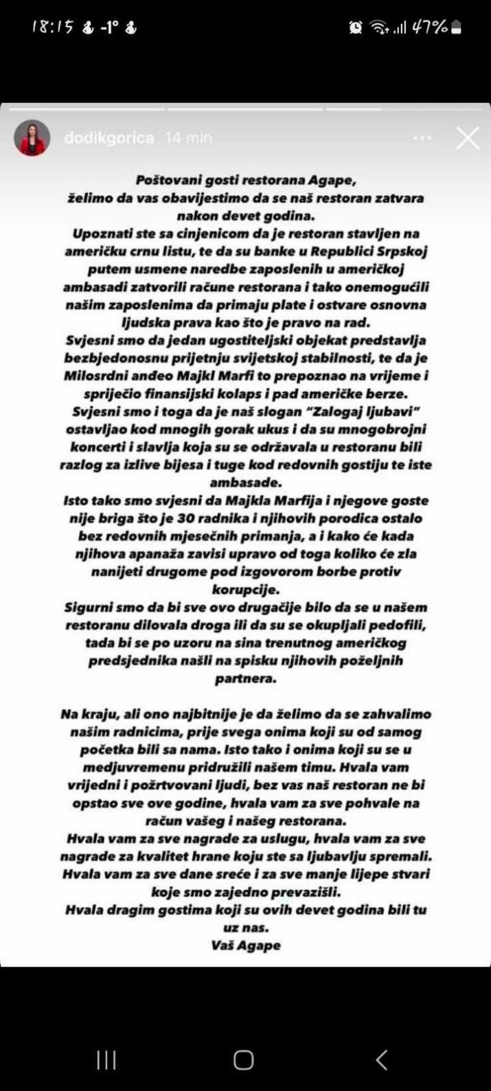 Objavu Gorice Dodik, kćerka aktuelnog predsjednika RS, objavila je na društvenim mrežama poruku koju prenosimo u cjelosti: