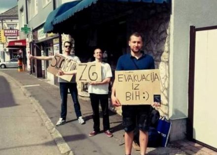 Svaki od mladića u rukama drži karton na kojem piše gdje su planirali da idu, pa tako jedan traži prevoz za Sloveniju, jedan za Hrvatsku, a treći traži “evakuaciju iz BL”.