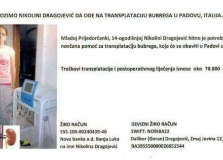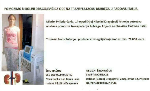 U Prijedoru je pokrenuta humanitarna akcija prikupljanja novčane pomoći za četrnaestogodišnju Nikolinu Dragojević kojoj je hitno potrebno presađivanje bubrega.