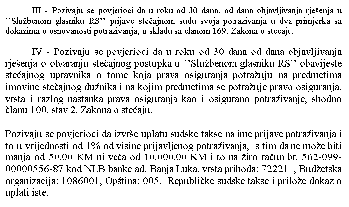 „Pozivaju se povjerioci da izvrše uplatu sudske takse na ime prijave potraživanja i to u vrijednosti od jedan odsto od visine prijavljenog potraživanja, s tim da ne može biti manja od 50 KM ni veća od 10.000 KM“, navedeno je u rješenju o otvaranju stečaja u „Bobar banci“.