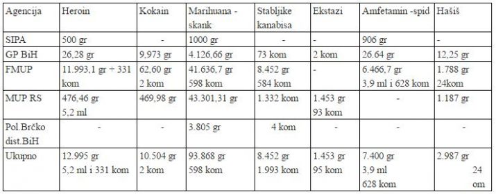Na osnovu prikupljenih operativnih podataka Ministarstva bezbjednosti BiH, područje Bosne i Hercegovine predstavlja tranzitnu liniju za krijumčarenja opojnih droga, a trenutno su u fazi prikupljanja podataka o oduzetim drogama za 2016. godinu od nadležnih policijskih agencija i nakon usvajanja Informacije o stanju bezbjednosti u BiH, podaci će biti dostupni javnosti.
