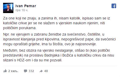 Ivan Pernar je na svojoj Fejsbuk stranici juče naveče objavio da nije katolik i da se ispisao iz Katoličke crkve.
