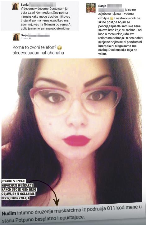 “Ne mogu da dođem sebi od šoka. Telefon ne prestaje da zvoni. Udata sam i imam dva mala sina, i takvim poslovima se ni u najluđim snovima ne bih bavila. Zovu me i pišu mi razni nepoznati muškarci, raspituju se jesam li za druženje, masažu. Prvo mi se javio muškarac koji je sebe nazivao galantnim gospodinom, a odmah zatim i mnogi drugi. Neki su nudili druženje, neki dopisivanje… Sanja je utom objavila na svom Fejsbuk profilu: “Koja je sledeća za oglaščiće” i “Kome to zvoni telefon? Sledeća”. Vidjela sam da je i ostavljala komentare gdje je govorila da nismo svjesne kako ona može da nabavi naše brojeve telefona i da su sve koje kažu nešto loše o njoj sledeće za oglase, ali i da se policije ne boji”, kaže Jovana.