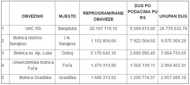 Ukupan dug za doprinose prema Fondu zdravstvenog osiguranja RS na kraju pro{e godine iznosio je 279,6 miliona KM, a najveci dužnici, kada su u pitanju zdravstvene ustanove su Univerzitetsko-klinicki centar RS, Bolnica Istocno Sarajevo, Bolnica “Sveti apostol Luka” iz Doboja, Univerzitetska bolnica Foca, te Bolnica Gradiška.
