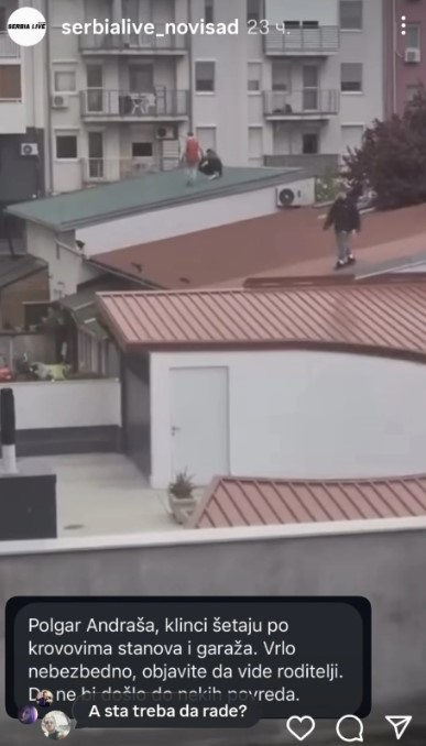 Kako je napisala u opisu video snimka koji je podelila sa Instagram stranicom serbialive_novi sad, u ulici Polgara Andraša u ovom gradu djeca imaju novu zabavu – šetanje po krovovima stanova i garaža.