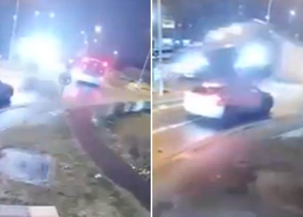 Na snimku se jasno vidi da je vozač “mercedesa” vozio brzinom znatno većom iznad dozvoljene, praktično presjekavši kružni tok i podigavši se poput aviona, iznad dva automobila koja su se pripremala da regularno uđu u raskrsnicu.