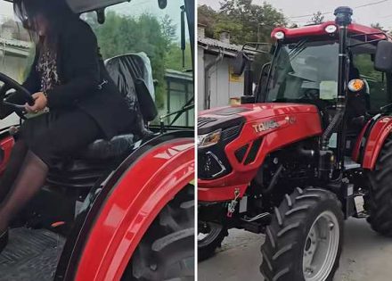 Naime, kako se vidi na snimku ona je upravljala traktorom noseći štikle.