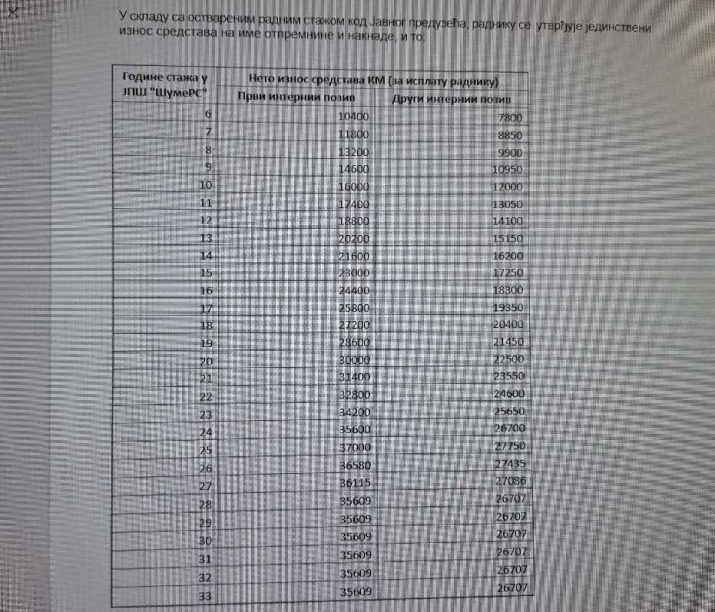 Visina ukupnog iznosa za radnike koji dobrovoljno napuste preduzeće zavisi od godina radnog staža provedenog u „Šumama“ i kreće se od 10.400 KM za one koji u ovom javnom preduzeću rade samo šest godina do maksimalno 37.000 maraka koliko je predviđeno za radnike sa 25 godina staža u „Šumama“.