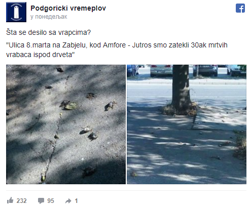 Na Facebook stranici “Podgorički vremeplov” objavljene su fotografije mrtvih vrabaca.