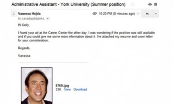 Umjesto da pošalje svoj CV i propratno pismo, slučajno je zakačila smiješnu fotku Nikolasa Kejdža. Ovu, u poslovnom svijetu ozbiljnu grešku, otkrila je tek nakon slanja maila, a tada je već bilo kasno. Svoju brljotinu je podijelila sa followerima na Tumblr blogu i postala zvijezda preko noći!