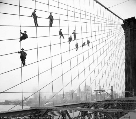 Jedna od zanimljivijih fotografija prikazuje radnike koji vise sa Bruklinskog mosta i vrše popravke na njemu 1914. godine, 31 godinu nakon što je zvanično pušten u rad.