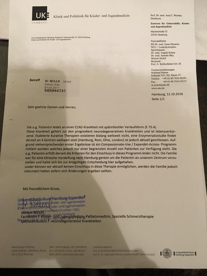 Nakon sto smo u januaru uspjeli da Anju dovedemo u UKE Hamburg na pretrage, sada nakon 10 mjeseci, odbijeno je da Anja bude primljena kao pacijent,jer ne ispunjava kriterije ( Uzimaju se djeca koja jop mogu da hodaju, sto Anja ne može ).
