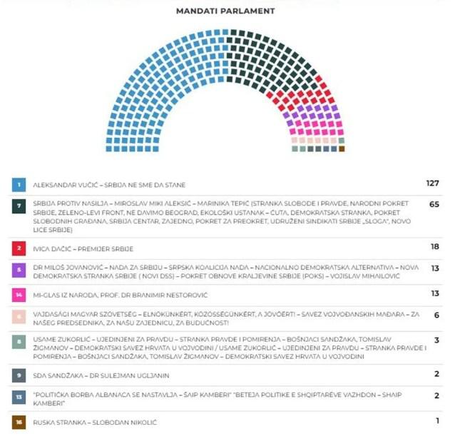 Na osnovu 88,4 odsto obrađenog uzorka, a prema posljednjim projekcijama IPSOS/CeSID, lista “Srbija ne sme da stane” osvojila je na parlamentarnim izborima 46,4 odsto glasova, što znači da će imati 128 mandata u Narodnoj skupštini, lista “Srbija protiv nasilja” 23,6 odsto, što je 65 mandata, a lista oko SPS-a je 6,6 odsto, odnosno 18 mandata.