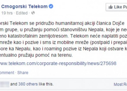Toj akciji priključio se i Crnogorski Telekom. Ovaj mobilni operater omogućio je svim svojim korisnicima besplatne pozive iz fiksne mreže, kao i besplatne pozive i SMS poruke iz mobilne mreže ka Nepalu. Takođe su besplatni i roming pozivi iz Nepala koji naprave korisnici koji pružaju pomoć na terenu.