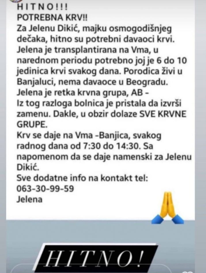 “Jelena je transportovana na VMA u Beogradu, a u narednom periodu potrebno joj je šest do 10 jedinica krvi svakog dana. Kako se dalje navodi, majka osmogodišnjaka nema davaoce u Beogradu. Porodica joj žvi u Banjaluci. Jelena je rijetka krva grupa – AB. Iz tog razloga bolnica je pristala da izvrši zamjenu. Iz tog razloga u obzir dolaze sve krvne grupe”, piše u apelu.