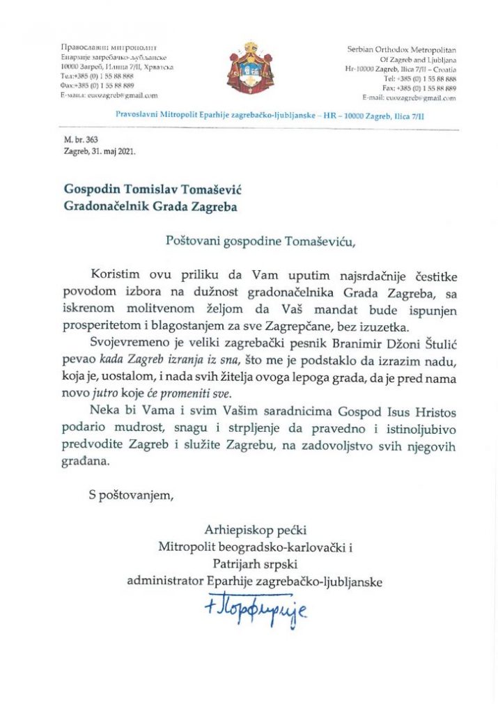 Patrijarh srpski Porfirije, uputio je čestitku novoizabranom gradonačelniku Zagreba Tomislavu Tomaševiću.