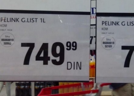 Čitalac Monda poslao je fotografiju iz jednog velikog trgovinskog lanca u Srbiji na kome se vide dve table sa cijenama. Na jednoj se litar “pelinkovca” prodaje po cijeni od 749,99 dinara, a na drugoj je ista cijena, ali za pakovanje od 0,7 litara!?