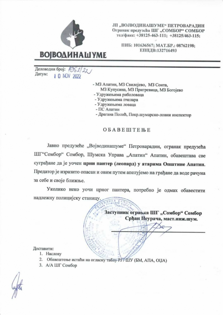 Javno preduzeće “Vojvodinašume” Petrovaradin, ogranak preduzeća ŠG “Sombor” saopštilo je da je u atarima Opštine Apatin uočen crni panter.