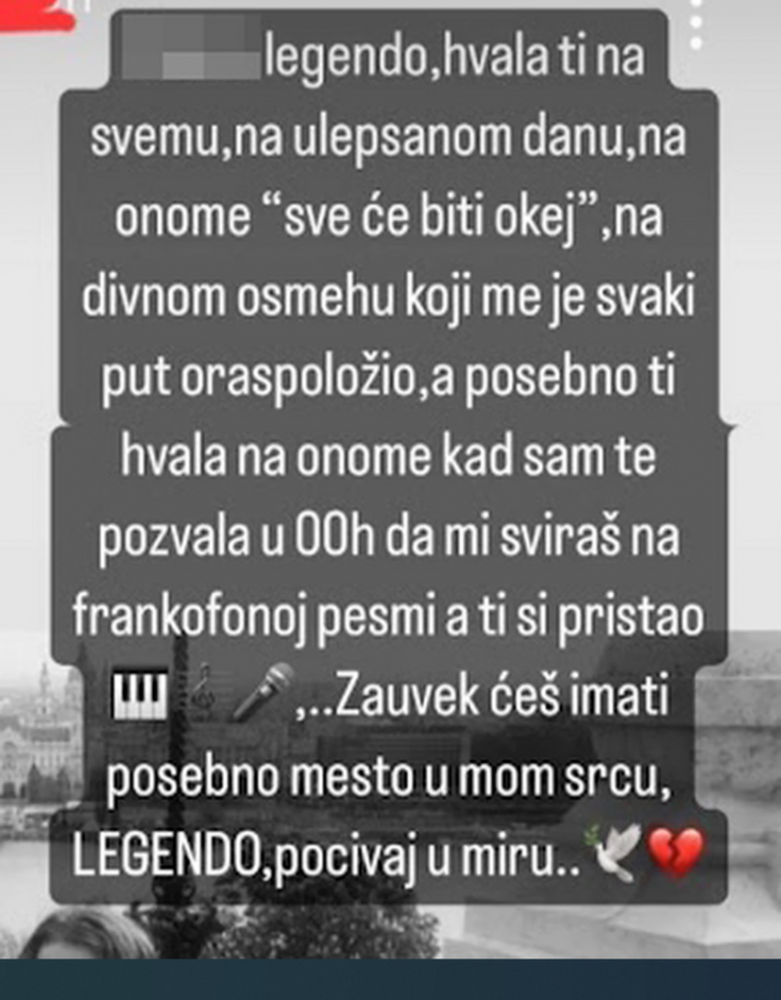 “Legendo, hvala ti na svemu. Na uljepšanom danu, na onome “sve će biti okej”, na divnom osmijehu koji me je svaki put oraspoložio, a posebno ti hvala na onome kada sam te pozvala u ponoć da mi sviraš, a ti pristao”, piše u jednoj od objava posvećenih ubijenom dječaku A.Č.