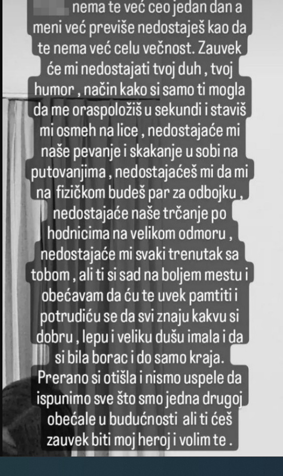 “Nema te već cijeli dan, a meni već previše nedostaješ, kao da te nema već cijelu vječnost. Zauvijek će mi nedostajati tvoj duh, humor, način na koji si samo ti mogla da me oraspoložiš u sekundi i staviš mi osmijeh na lice. Nedostajaće mi naše pjevanje i skakanje u sobi na putovanjima. Nedostajaćeš mi da mi na fizičkom budeš par za odbojku, nedostajaće mi naše trčanje po hodnicima na velikom odmoru, nedostajaće mi svaki trenutak sa tobom, ali ti si sada na boljem mjestu. I obećavam da ću te uvijek pamtiti i potrudiću se da svi znaju kakvu si dobru, lijepu i veliku dušu imala i da si bila borac do samog kraja. Prerano si otišla i nismo uspjele da ispunimo sve što smo jedna drugoj obećale u budućnosti, ali ti ćeš uvijek biti moj heroj i volim te”, napisala je drugarica ubijene E.K.
