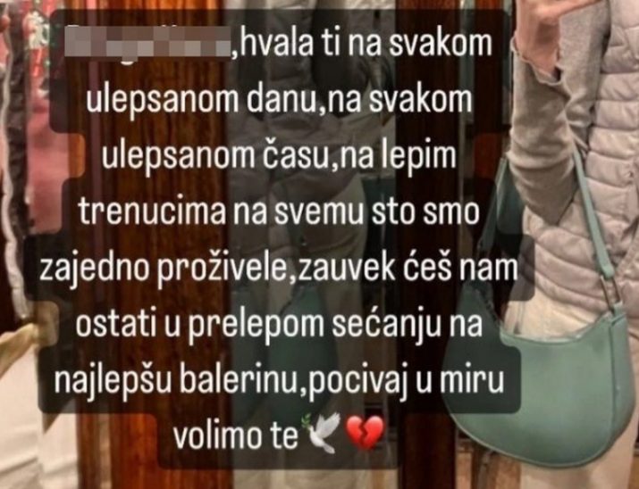 “Hvala ti na svakom uljepšanom danu, na svakom uljepšanom času, na lijepim trenucima, na svemu što smo zajedno proživjele. Zauvijek ćeš nam ostati u prelijepom sjećanju na najljepšu balerinu, počivaj u miru. Volimo te”, piše u jednoj od oproštajnih poruka za K.M., piše Blic.