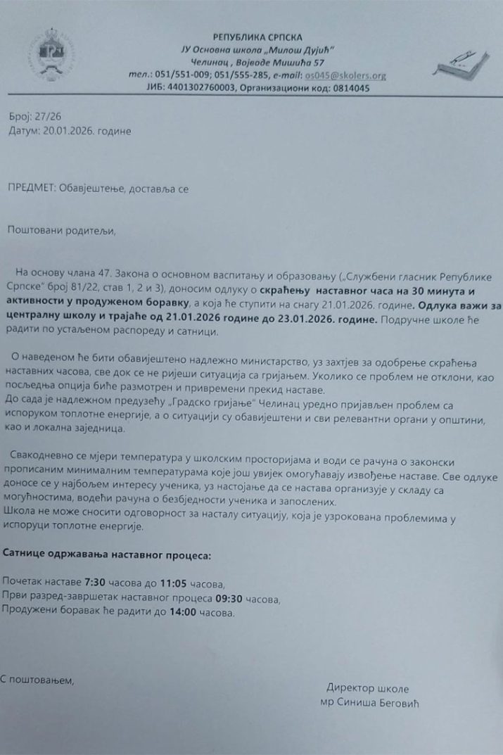 Osnovna škola “Miloš Dujić” iz Čelnica najavila je skraćenje časova na 30 minuta zbog problema sa grijanjem, a kao opciju, ukoliko se ne riješi problem, navode i obustavu nastave.