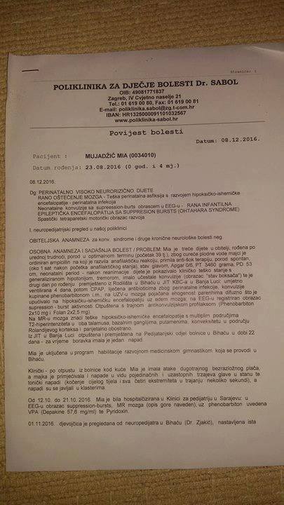 Pored primarne bolesti, teškog oboljenja mozga, mikrocefalije – epilepsije, Mia je dobila upalu pluća, te je trenutno hospitalizirana na pedijatriji u Kantonalnoj bolnici “Dr. Irfan Ljubijankić”. S njom je njena mama Renata.