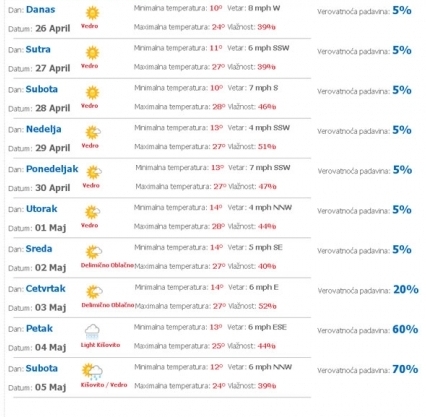 Temperature vazduha dostići će 28 stepeni Celzijusa. Meteorolozi najavljuju da će se sunčano vrijeme zadržati i sljedeće sedmice.