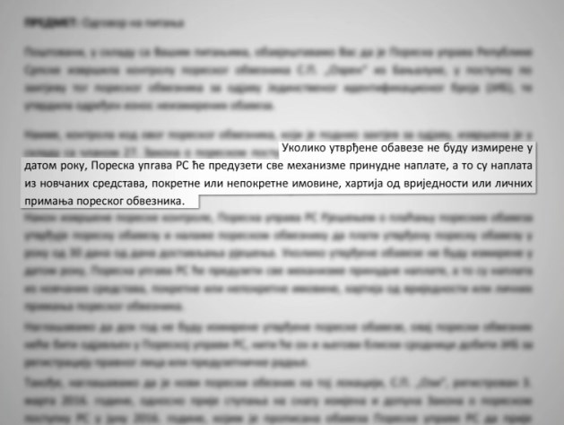 “Ukoliko utvrđene obaveze ne budu izmirene u datom roku, Poreska uprava RS će preduzeti sve mehanizme prinudne naplate, a to su naplata iz novčanih sredstava, pokretne ili nepokretne imovine, hartija od vrijednosti ili ličnih primanja poreskog obveznika”, rečeno je u Porskoj upravi RS.