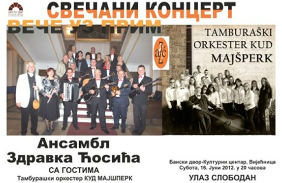 U Koncertnoj dvorani Banckog dvora, u subotu, 16. juna, sa početkom u 20 časova, biće održan koncert Tamburaškog orkestra Zdravka Ćosića, pod nazivom „Veče uz prim”. Gosti na ovom koncertu biće članovi Tamburaškog orkestra KUD „Majšperk” iz Slovenije.