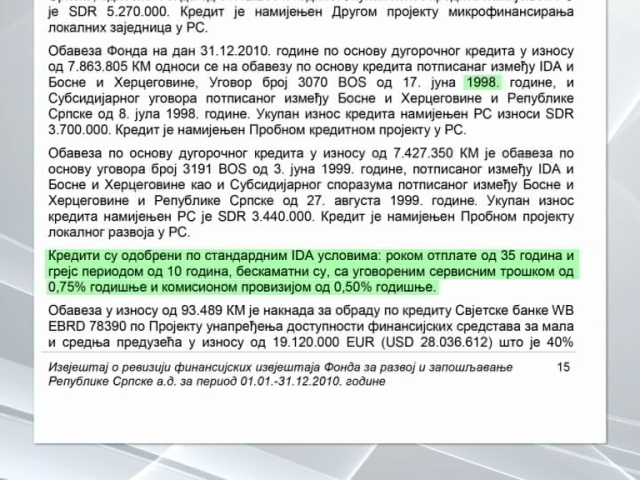 Krediti su odobreni 1998. i 2002.godine sa rokom otplаte od 35 godinа i grejs periodom od 10 godinа, beskаmаtni su, sа ugovorenim servisnim troškom od 0,75% godišnje.