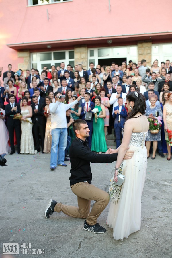 Naime, nakon što su maturanti pozirali ispred škole za grupnu fotografiju, Aleksandar Čomić kleknuo je na koljena i zaprosio svoju djevojku, maturantkinju Nikolinu Vujović. Dok je muzika svirala, a u vazduhu letjele konfete koje su sa prozora škole ispalili Aleksandrovi prijatelji, Nikolina je rekla “da”.