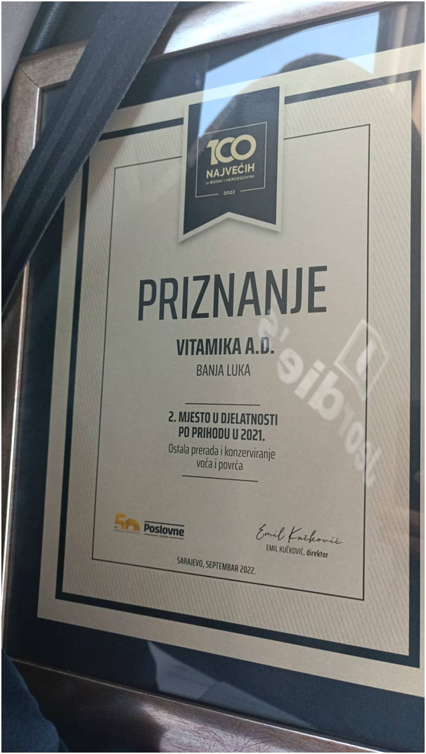 Kompaniji “Vitaminka” koja ima dugogodišnju tradiciju, sinoć je dodijeljeno priznanje za drugo mjesto u djelatnosti po prihodu u 2021. godini u kategoriji prerada i konzerviranje voća i povrća.