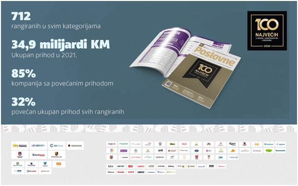 Kompletne rang-liste TOP 100 u regionu, kao i u kategorijama velike srednje i male kompanije u BiH, po ostvarenom prihodu, izvozu i dobiti, uključujući i analize djelatnosti i TOP 20 u svakoj od djelatnosti biće objavljene u specijalnoj printanoj publikaciji “100 najvećih u BiH i regionu” koja je promovisana na najvećem skupu lidera BiH i regiona, u etno selu “Herceg u Međugorju”.
