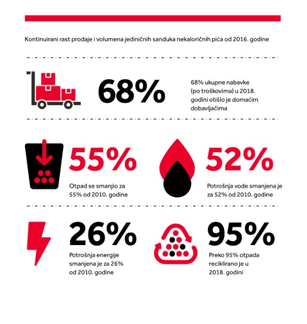 Od ukupno 120 miliona litara bezalkoholnih pića koje Coca-Cola HBC B-H uvozi ili proizvodi za domaće tržište, 89% proizvodi se u Bosni i Hercegovini, a 68% ukupne nabavke (po troškovima) u 2018. godini otišlo je domaćim dobavljačima. Kroz ispunjenje ciljeva održivog poslovanja Coca-Cola HBC B-H nastoji neprekidno smanjivati direktan uticaj na okolinu koji ostvaruje vlastitim aktivnostima, a i indirektni uticaj koji se ostvaruje aktivnostima dobavljača i poslovnih partnera. Tako se količina otpada smanjila za 55% od 2010. godine, od iste godine je smanjena i potrošnja vode za 52%, a preko 95% otpada reciklirano je u 2018. godini. Ukupna količina ispuštene pročišćene vode smanjena je za 17,5% od 2014. godine.
